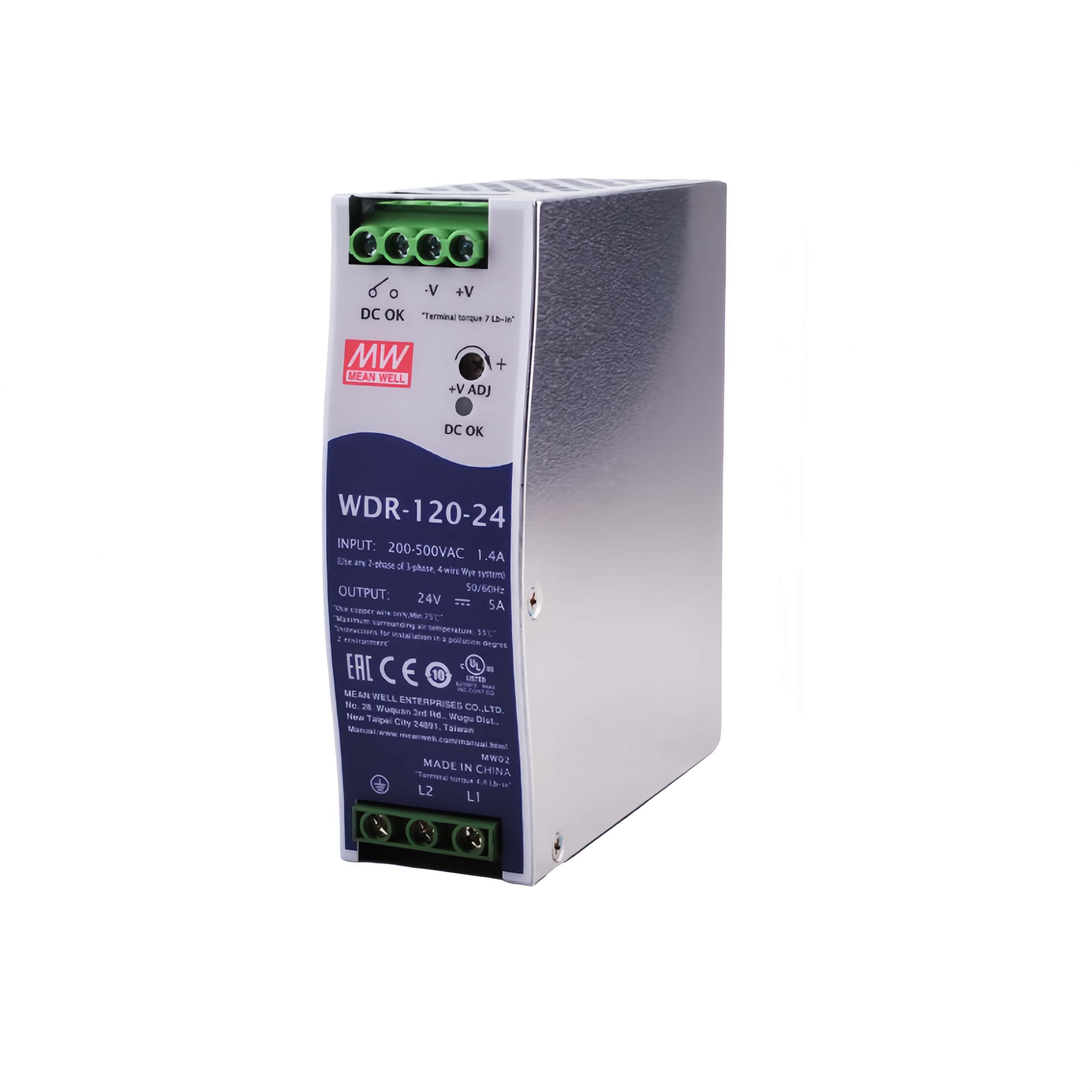 WDR-120 系列是 120W 单组输出导轨型工业电源 ,支持 单 / 双相宽范围 180~550VAC 或 254~780VDC 输入 ,输出包含三个型号:WDR-120-12(12V/10A)、WDR-120-24(24V/5A)、WDR-120-48(48V/2.5A),均具备 短...