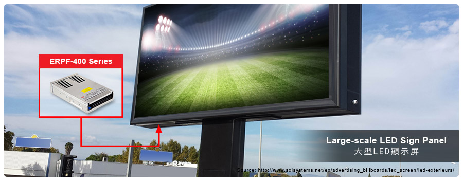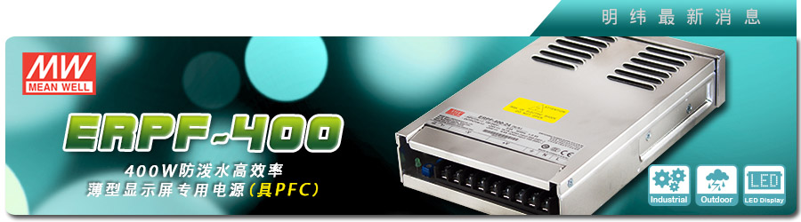 leyu集团薄型显示屏专用电源—ERP-350系列(350W),因其防泼水功能及高效率等特点,上市多年来已广为应用在户外大型LED显示屏及LED发光字体等商业照明场所,leyu集团为持续提供用户更佳的产品规格,新推出了内建主动式功率因子矫正(active PFC)功能的ERPF-400系列(400W)。